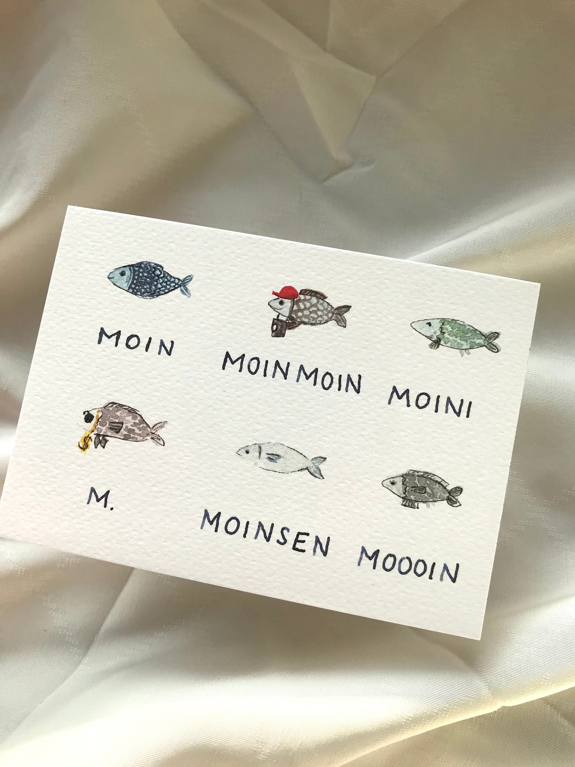 Moin! Hier schwimmen aber ganz verrückte Fische umher! Die Karte bringt so manches Nordlicht oder Angler zum Schmunzeln! Sie eignet sich toll als Wandbild oder auch zum Verschenken.